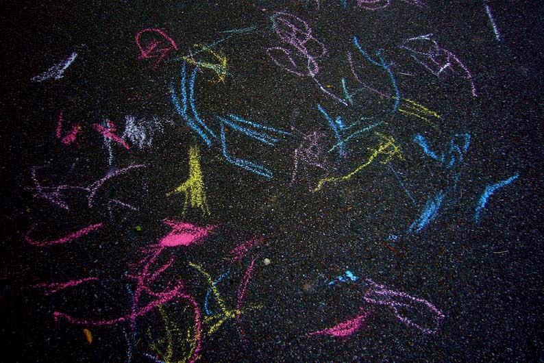 | 路上の子供の作品(?)。 青チョークの動きを見ると、腕全体で描いていると判 る。 その後に黄色、赤を載せて行った。 雨が降ると消えて行ってしまう、即興作品。 |