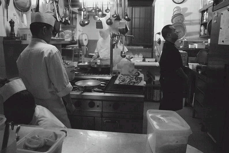 | 今週からは違う店で、今度は市川さんと一緒に厨房に入る。 9時過ぎ、お客が入ってきて満席になると、厨房は戦場と化す。 怒号の中、フライパンが飛び交い、ソースがほとばしる。 オーダーを見ながら作戦を練る市川さんと、臨戦態勢の兵士達。 この店はフィリピン人、エクアドル人、アルゼンチン人の文化圏であった。 |