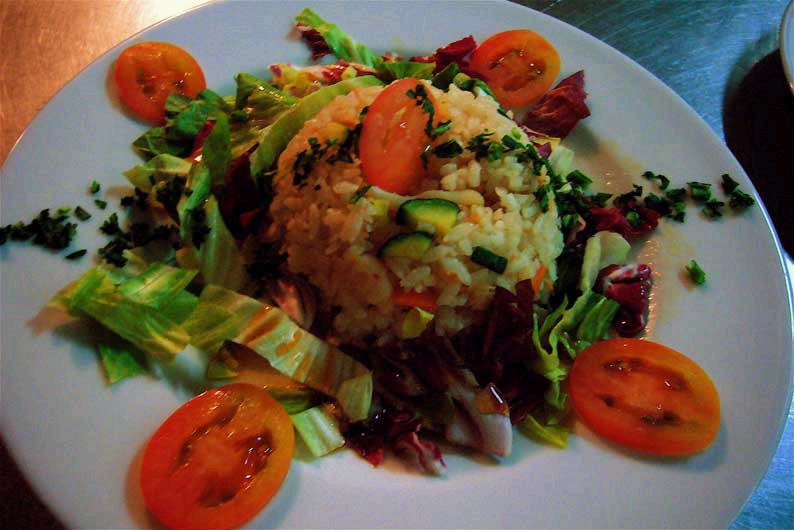 | そこでボクが出していた焼飯のお飾り。 たかが、白米の炒めたもので1000円以上頂くわけだから、お皿が食卓に下ろされ た瞬間に「オッ!」と思わせないと申し訳ない。 ちょっと、盛りつけに高級感が 無いので、改良の余地あり。 和風ドレッシングのサラダはイタリア人にも好評だった。 醤油は偉大な文化なの だ。 |
