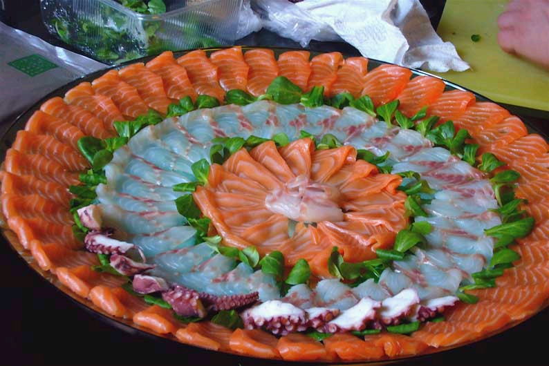 ない食器で苦労すると言うのも、楽しみの一つ。 タコを並べ始めたこの食器、実は数十年前にデザイナーのお父さんが入手したと言う投光器の反射鏡。 何と、カール・ツァイス・イエーナのマークが付いていて、光学マニアの僕をうならせた。 灯台か、戦争用の投光器か、そういう目的で生まれた東ドイツの反射鏡も、 まさ か数十年後にミラノで、ノルウェーのサーモンを載せることになるとは想像しな かったろう。 |