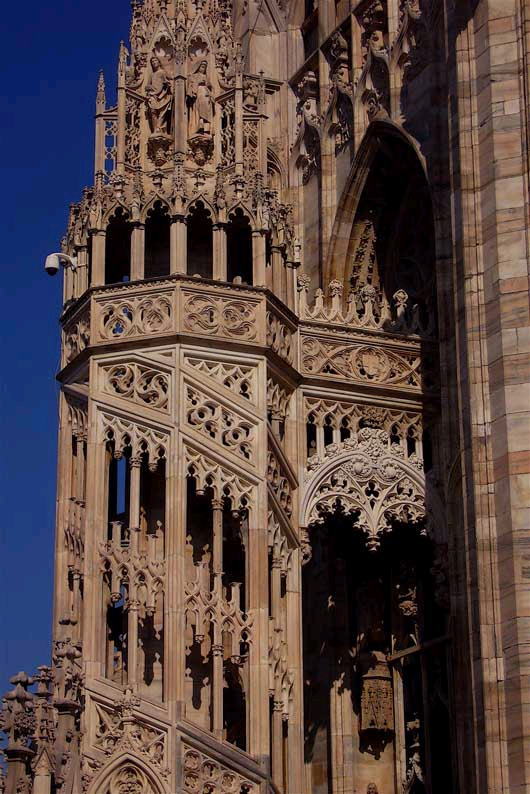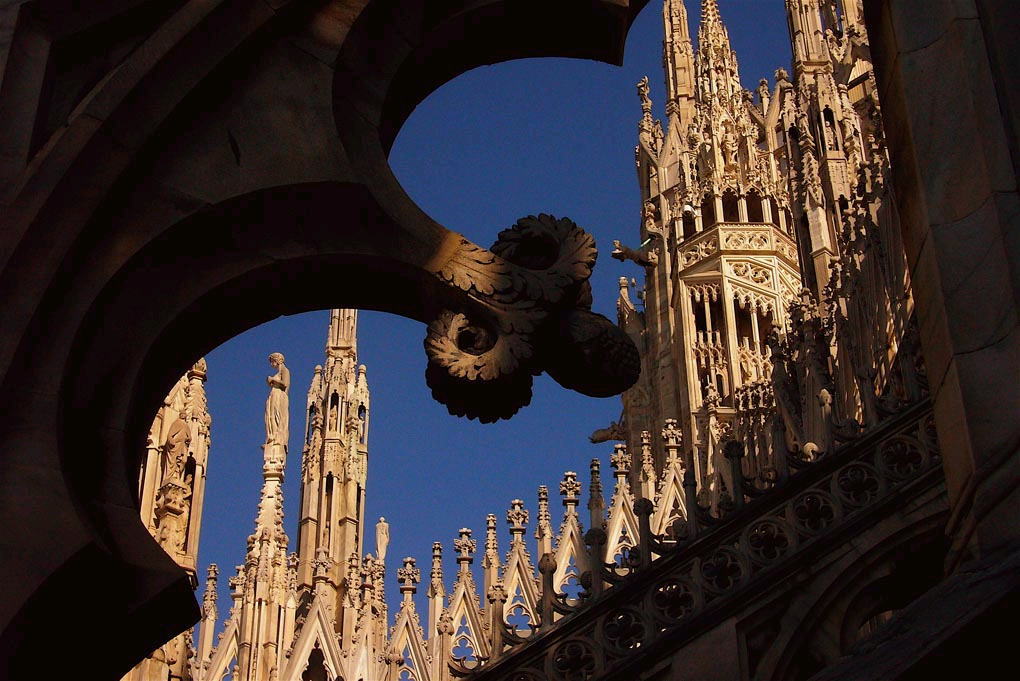 | 日本からグランシェフの河上さんが来て、ミラノ散策。 ドゥオモ屋上に上がる。 修復が終わったところは本当にキレイ。 スペインのアルハンブラ宮殿を思い出した。 「石で造ったレース編み」だ。 |