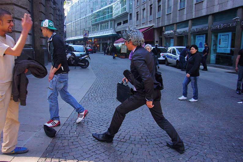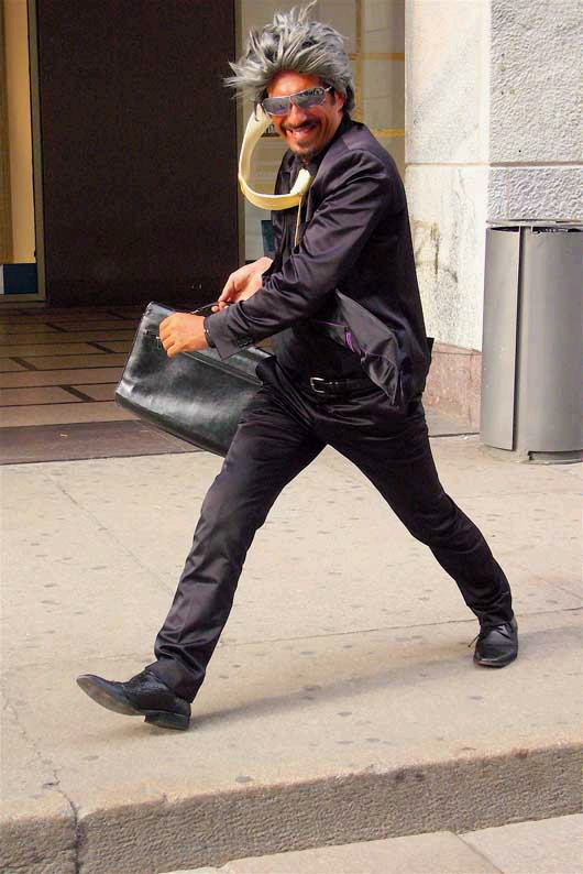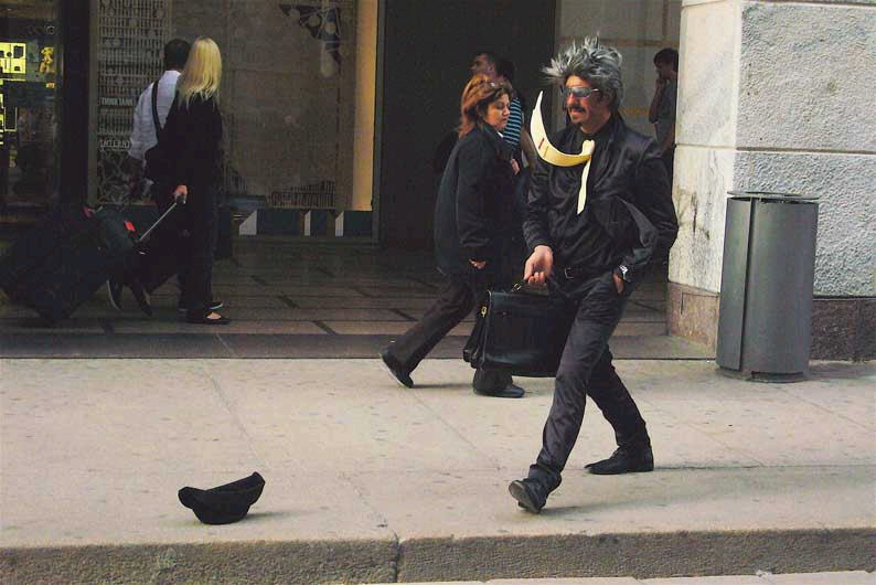 この人はこの格好でじっとしています。 存在自体が仕事、その2。 そこの帽子におカネをあげてね。 すると、ポーズを変えます。 おカネをあげないと動けないからカワイそう。 |