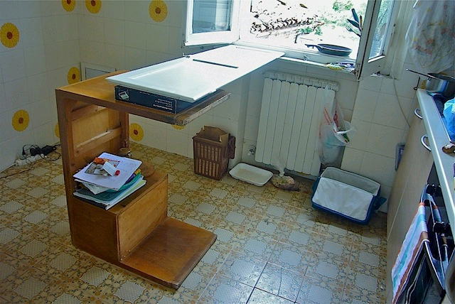せてみようと言う、 「調査捕鯨」のような試みをすることになり、日本食材と包 丁セットを持って出かける。 光はアンドレアというこれまた馬のように喰う同居人と住んでいるが、この二人 と、 その友人たちに二泊三日の日程で何種類かのメニューを試すことにした。 初日の夜はカツカレーであった、1リットルのカレーと10枚のトンカツが消えた。 翌日昼は天ぷら冷やしウドンを5人で。 ウドン9人前と天ぷら30ヶ消滅。 その夜 に、終業パーティーらしきものをしてやろうと思い立ち、 「寿司とかいろいろ、10 人くらいなら作れるよ、クラスの連中に声をかけてみな。 まあ、15人でも大丈夫 なようにしておくから」と言ってから仕事台をセット。 キッチンのテーブルは屋上のテラスで使うので机を横にして、窓の板を乗せてカウンターにする。 |