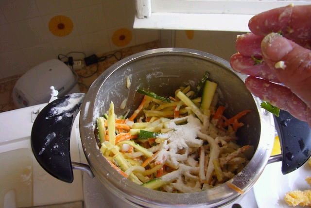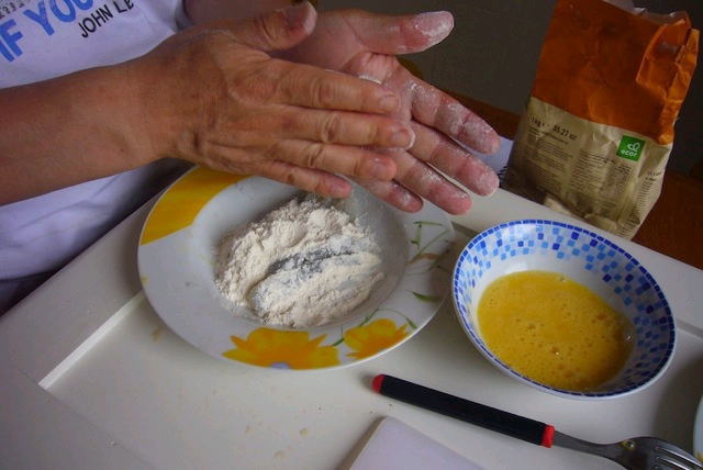 | 天ぷらの衣をつけるボールが無い。 ナベに直接、粉と卵水を入れるというやり方 に切り替える。 量を作るときに有効。 |