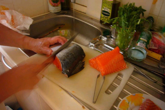 | サケの仕込み。 山の街だが、幸いサケのいいものがあったので1kgほど買う。 量 が量なので高いマグロは止めたが、サバとイワシは酢で締めた。 あとはエビと野 菜。 |