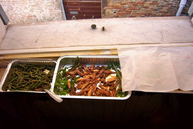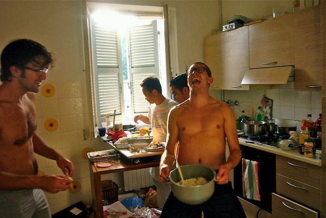 ガーン!メニューを急遽変更して、「腹に溜まる、腹が膨れる、食べやすく、皿 一枚で食べられるもの」中心にシフト。 ナベもカマも揃ってない、不自由なキッ チンで作り続ける。 青年たちも手伝うが、試食の量もすごい。 キッチンは戦場と化した。 左からアンドレア、オレ、光、ミケーレ |