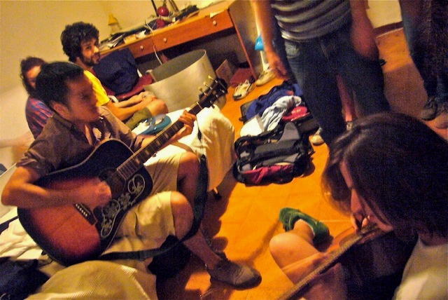 | 屋上の広いテラスで夜中の1時まで、それはすごい騒ぎ。 これは屋内でのジャム セッション。 酔うとさ、ギターとか、XXXとか抱きたくなるんだよね、判るよ。 パーティーは大好評、大成功。 翌日はちらし寿司とカレーライスを10人前で調査 終了、ボローニャに帰る。 |