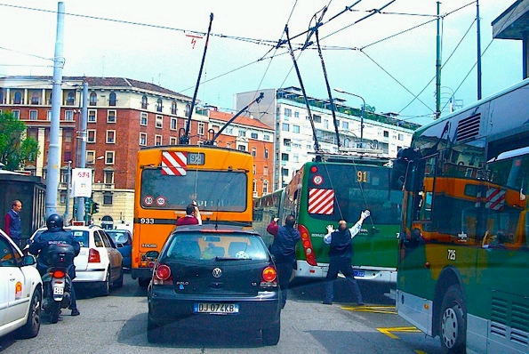 | トロリーバスの電線からガイドが外れて、交通渋滞。 手慣れたベテランおじさん が一発でハメて、バスは走り去っていった。 珍しいものを見させてもらった午後 。 |