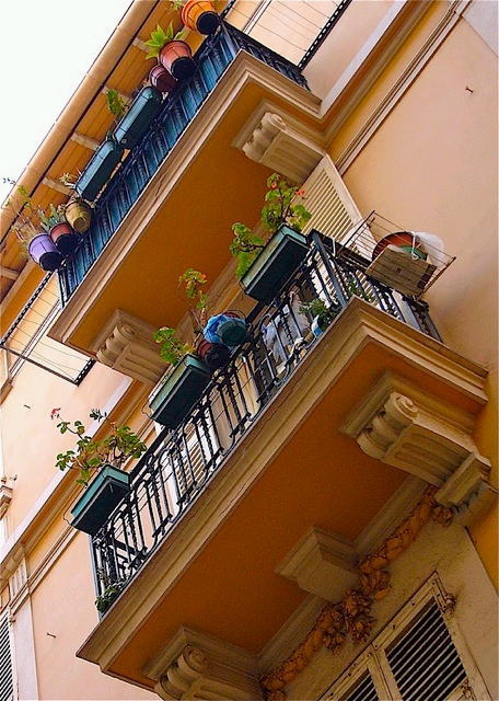 | 路地の店で遅い夕暮れに一人で食事。 石畳の道から見上げればベランダがあった。 きれいでシャレている。 南イタリアではこうはいかない、もっと、なんと言うか 人間臭い。 |