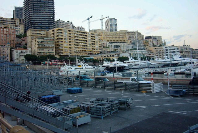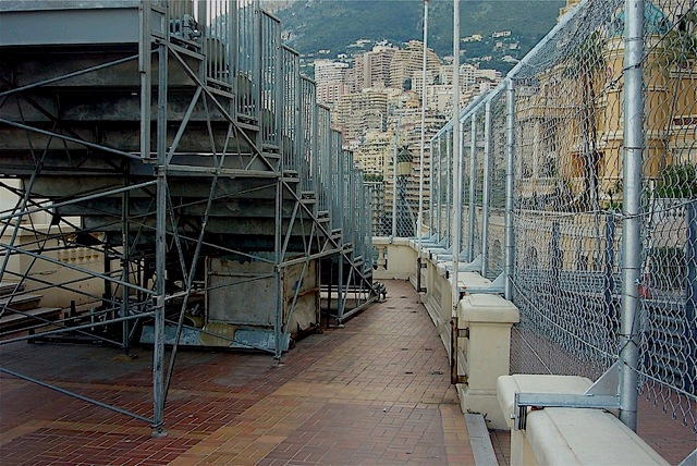 | 3日前に行われたF1レースの観客席がまだ解体されてなかった。 金網の向こうの狭い道を300kmで走るんだから、すごい迫力だろう。 |