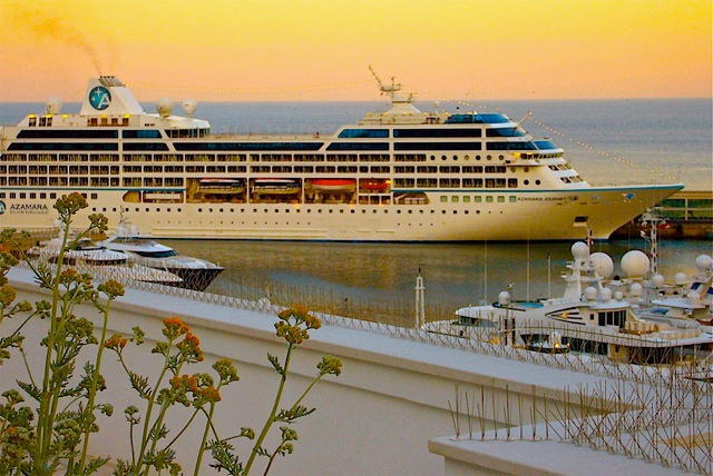 | クルージングの大きな船が停泊中で、夕焼け見ながらこれから好きな人と白ワイ