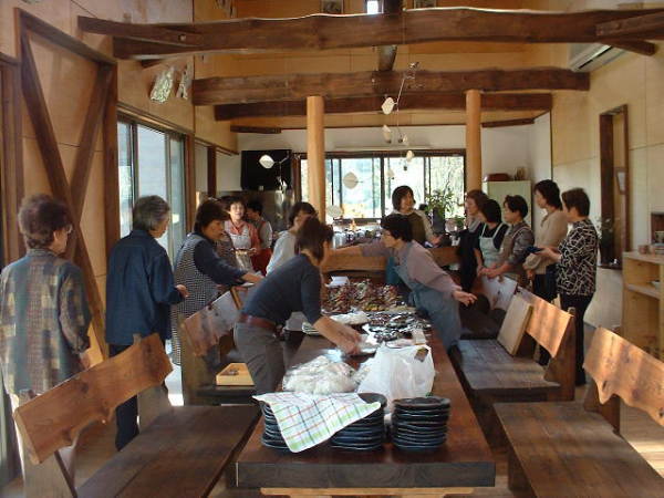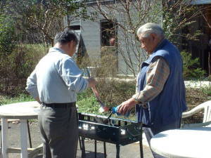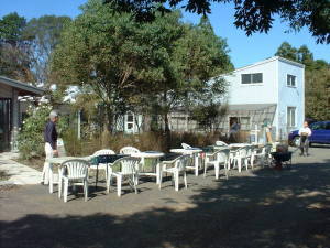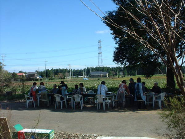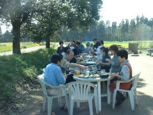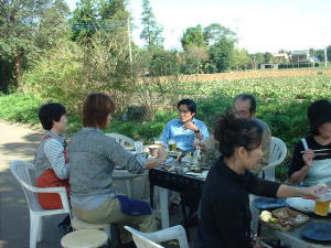 レストランを出て、前庭の木陰でわいわいがやがや・・・。