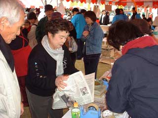 | 包むのも大忙し。てぎわよくお客さんに作品が手渡されていきます。 |