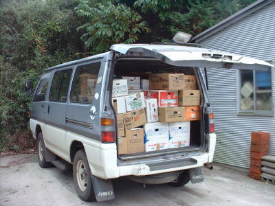 | 当日が雨の予報だったために、前日にすべて荷物を積み込みました。 この日のチャリティーのために、供出していただいた「間」の生徒さんたちの作品。 昨年よりもたくさんの点数が集まりました。 |