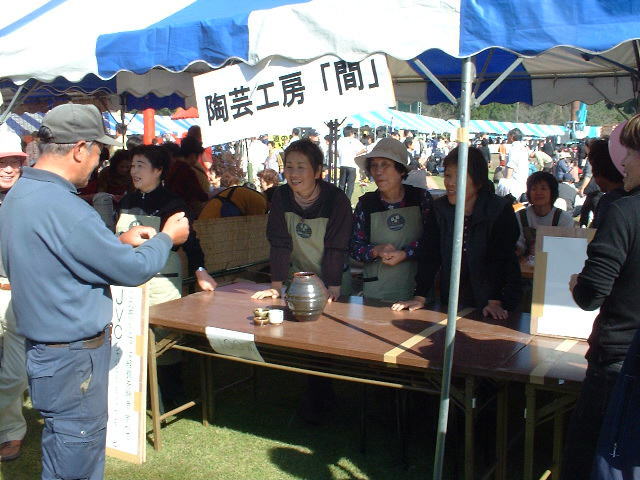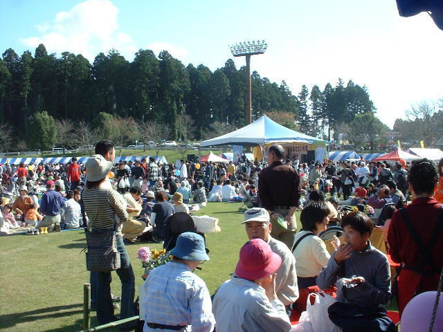 | 中央広場では、たくさんの人たちがステージのイベントを見て、楽しんでいます。 おいしそうに焼き芋を食べてますね。 |