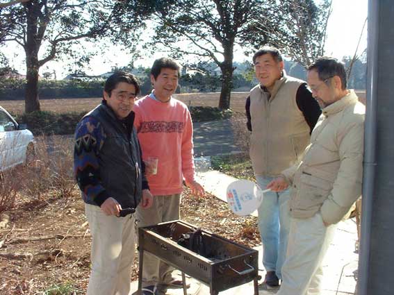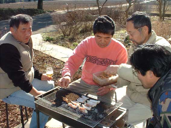 | とにかくすばらしいお天気の日で、もつ焼きのいいにおいがしてくると、 たまらずビール片手に宴会が始まってしまいました・・・。 |