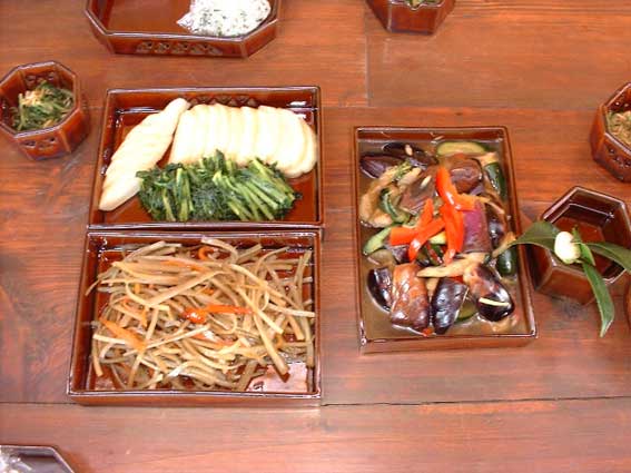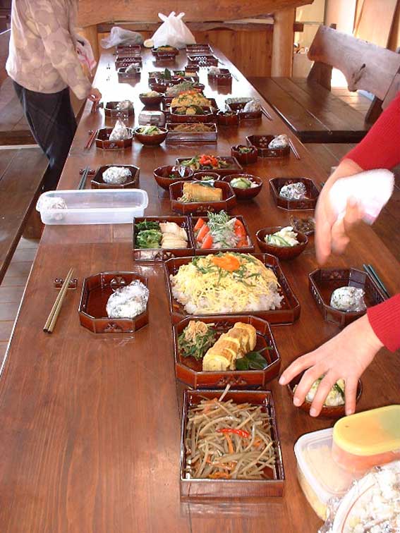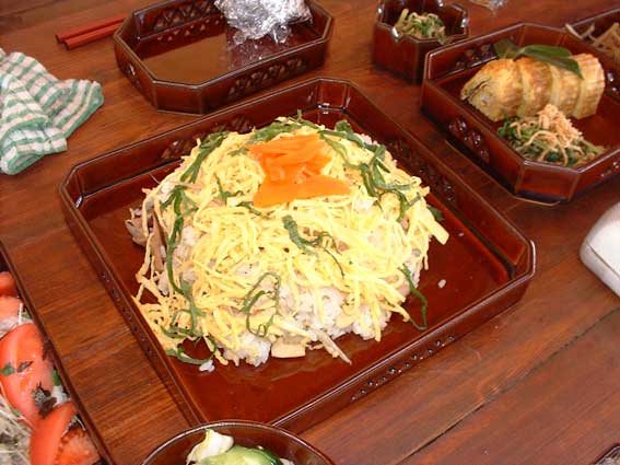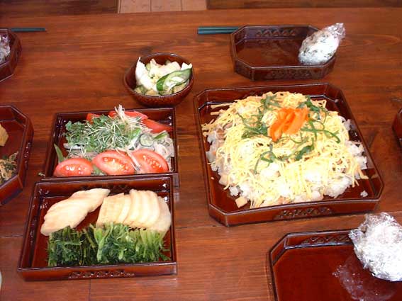 | このチラシ寿司は、飛び入り参加の植松さん作。 旧クラスメイトの土屋さんもお祝いに駆けつけました。 |