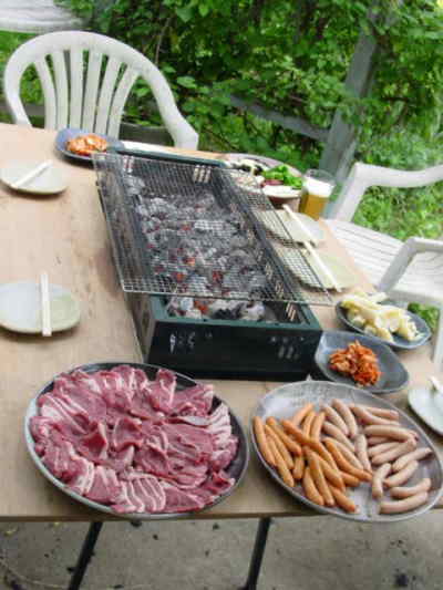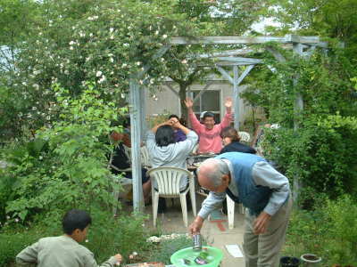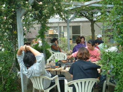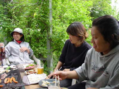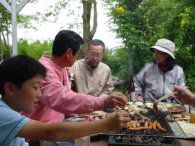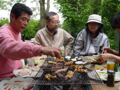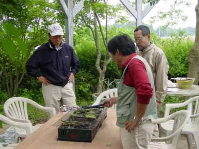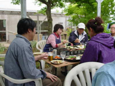 この日、かねてから話題になっていた、羊の肉の試食会が行われた。 自作の炭での焼肉。 食べたことのない人もいたが、一同、おいしい!と大満足だった。 そのほか、それぞれが持ち寄った自慢の自作野菜も焼いて 充実した試食会となった。