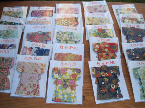 | 東松島市の仮設住まいの方が作った折り紙、お寺で祈願済みなのでお守りとして使えます。 | |