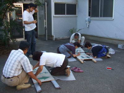 | 前日、場所がわかりにくい「間」へスムーズにお客さんに来ていただくために、みんなで道案内の看板を作りました。 | |