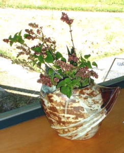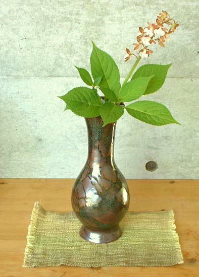 | 非常に魅力的な作品です。花のことを熟知しているうえで考えられた形です。 造形的なセンス、土のあつかいもうまい。 釉薬はひとつの色を加える、という感覚で掛けられています。還元炎焼成でさらに複雑な色が加わっています。 |