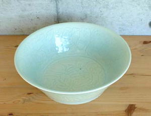 | 陶芸工房「間」教室生の実力派。磁器のろくろびきでも抜群の技術を持っています。 彫を入れる道具もすべて自作。その数も2,30本はある。たんねんに、ていねいに時間を掛けて仕上げていく。 なかなかまねのできない仕事です。 |