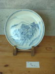伊藤祐二(E-1) 作るのにむずかしい磁器の皿です。染付けは濃淡が良くコントロールされています。 しかし、多少絵の題材にオリジナリティーが足りない気がします。 |