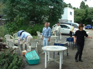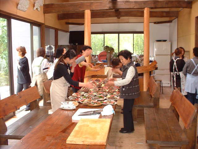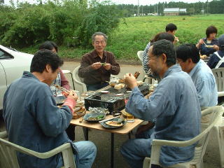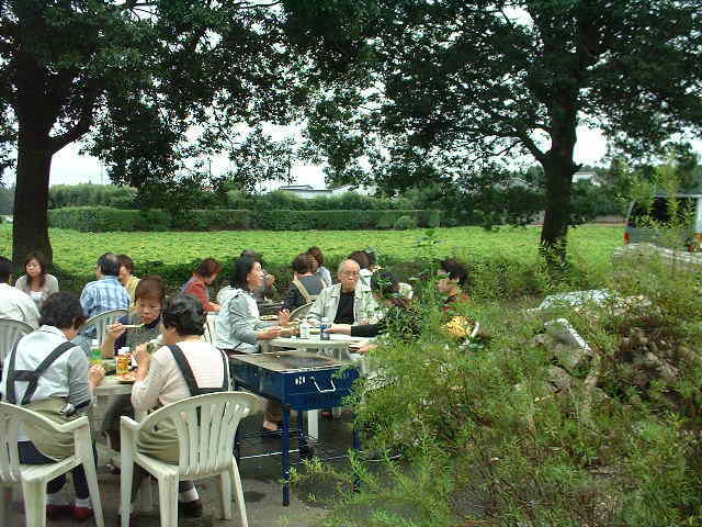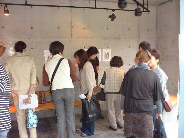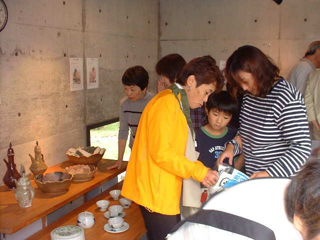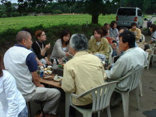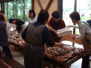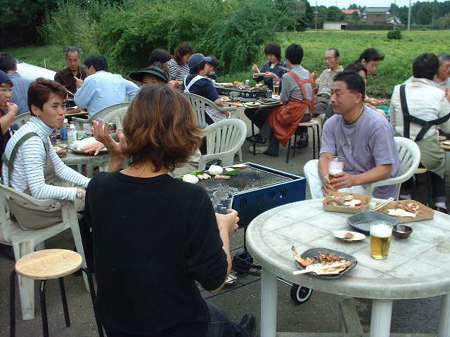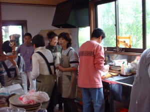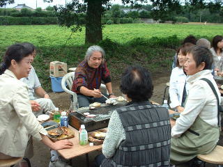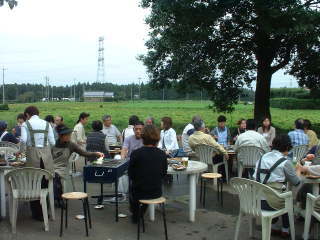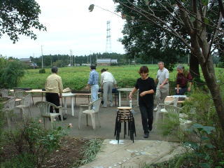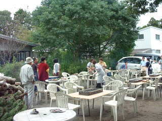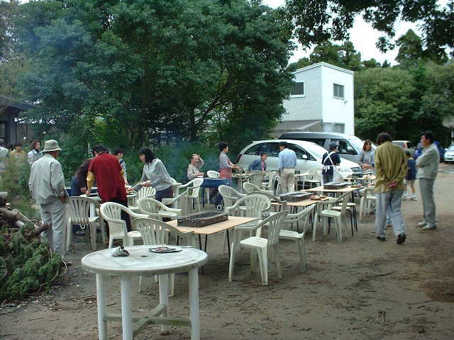 10月10日、Aグループの会期とBグループの会期の中間日に、 作品講評会とオープニングパーティーを開きました。 45人ほどの人が集まり、熱心に講評を聞き、そのあと作者を交えて バーベキューパーティーの準備に入りました。 前日の台風通過でお天気が心配でしたが、幸い翌日は何とか曇り空ながら 雨は降らずにすみました。 大勢の生徒さんたちが技法の詳しい説明など、熱心に耳を傾けていました。 パーティは例年になくたくさんの参加者で、大いに盛り上がりました。